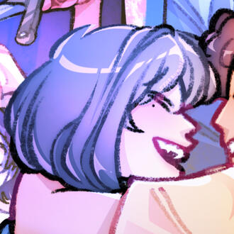Colored sketches of chosen character(s) with limited/cell shading. Minimal background.